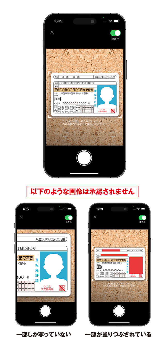 年齢確認書類は一部を隠したりせず、全体が見えるように撮影してください。